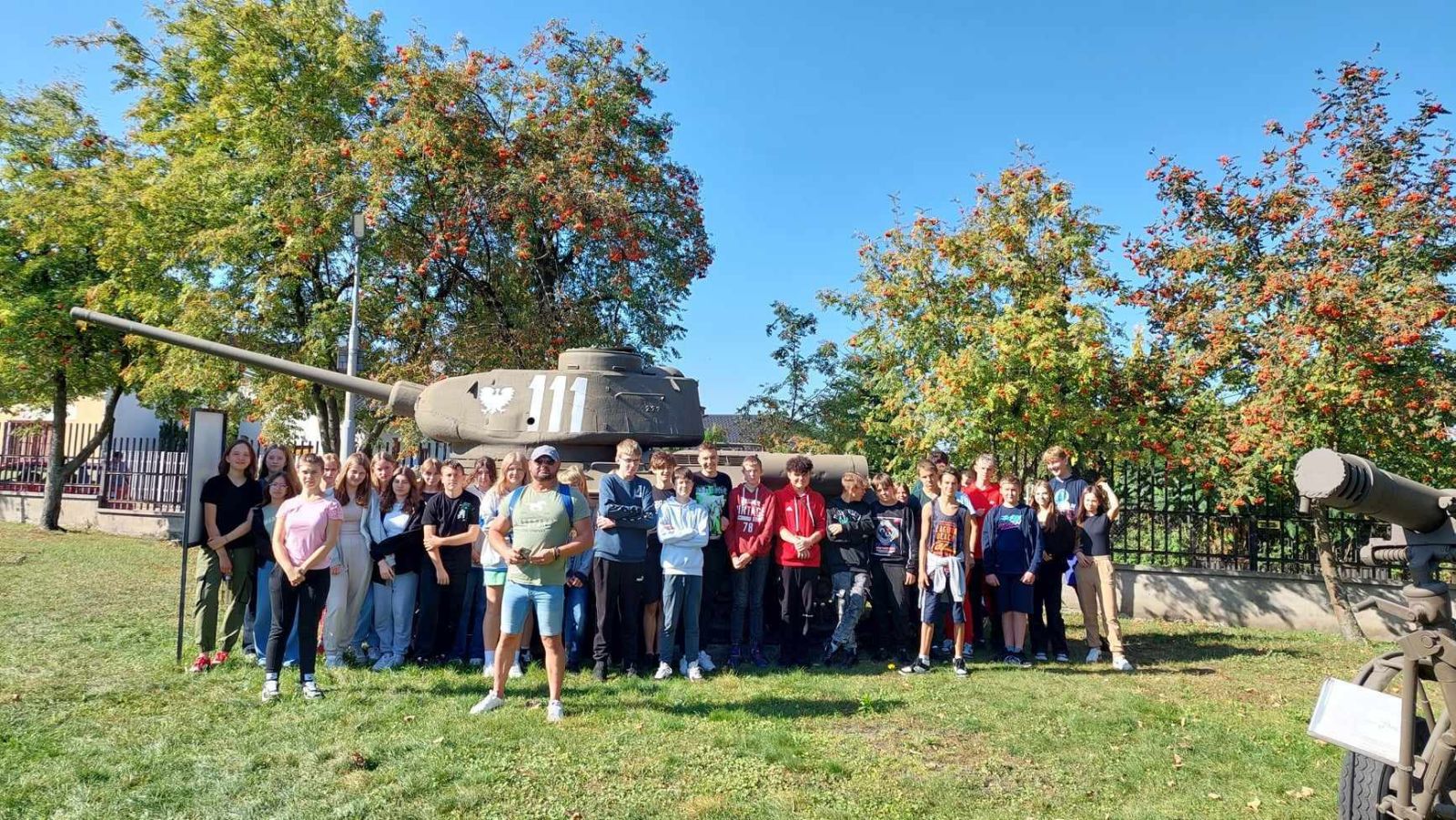 • Uczniowie z nauczycielami stoją w grupie. Za nimi stoi czołg