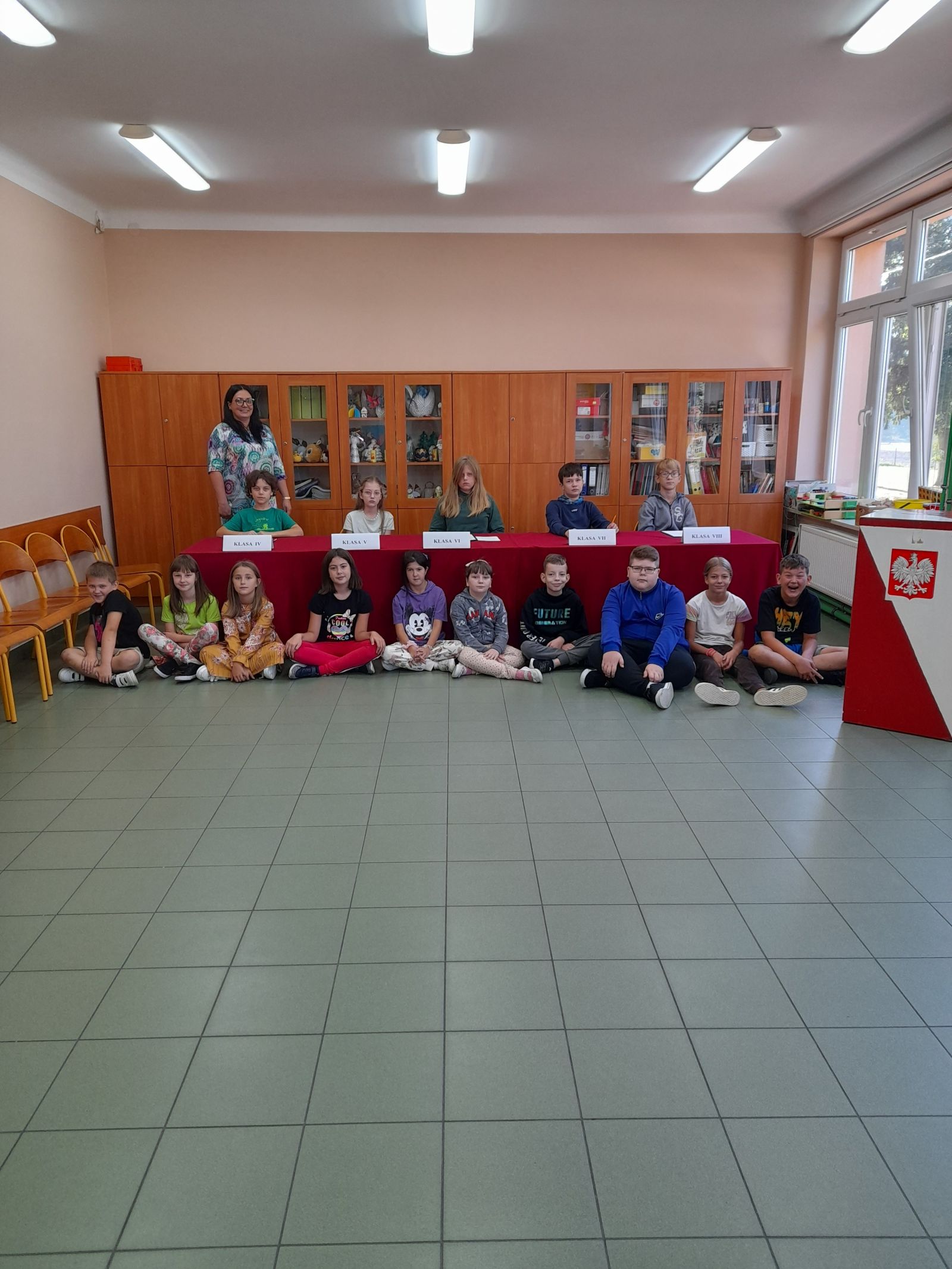• Na podłodze siedzą uczniowie klasy piątej z nauczycielem, za nimi na krzesłach przy stole siedzi komisja uczniowska